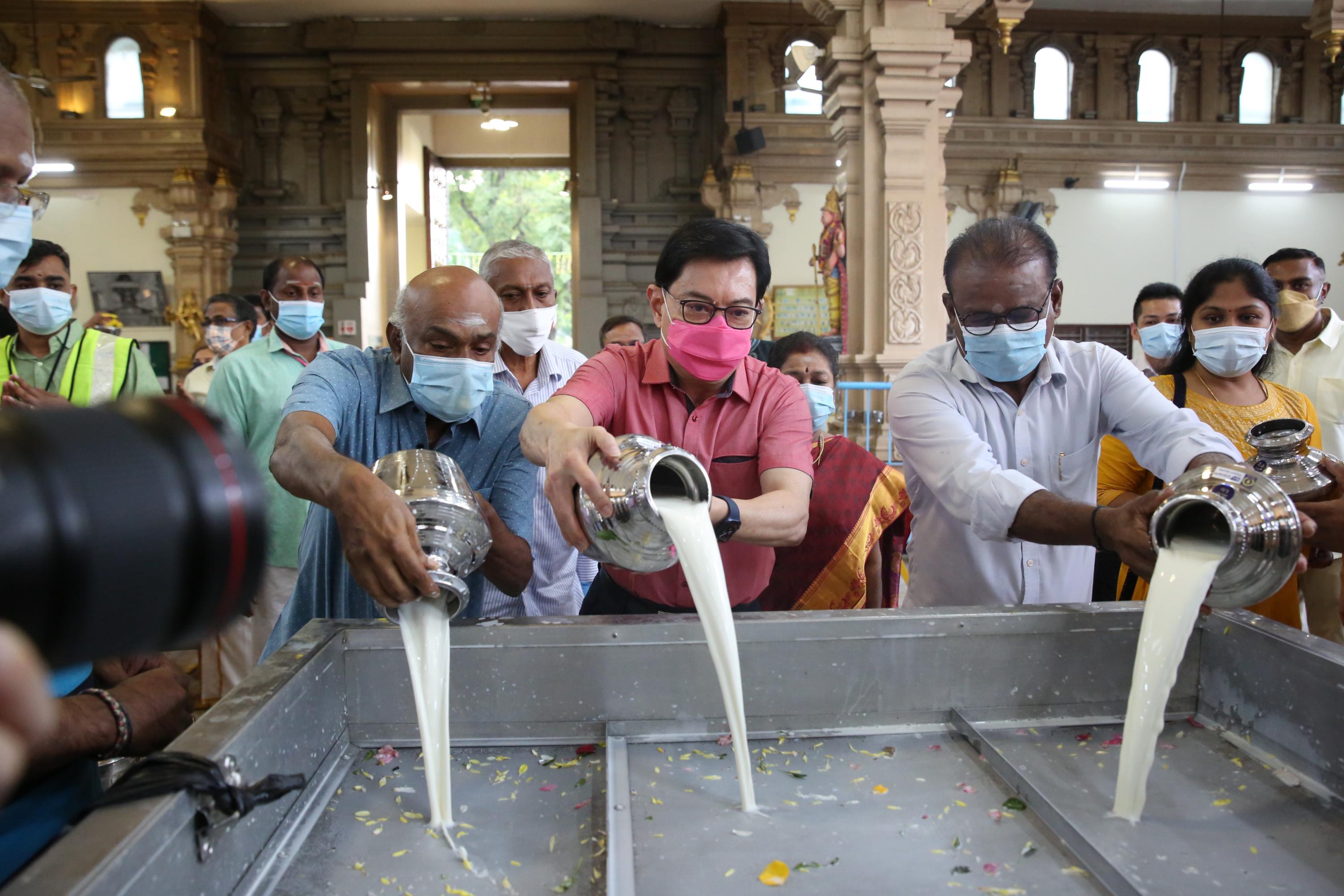 Deputy Prime Minister Heng Swee Keat carrying the paalkudam (milk pot) and making an offering at the sanctum of Sri Thendayuthapani Temple on Jan 18, 2022.
