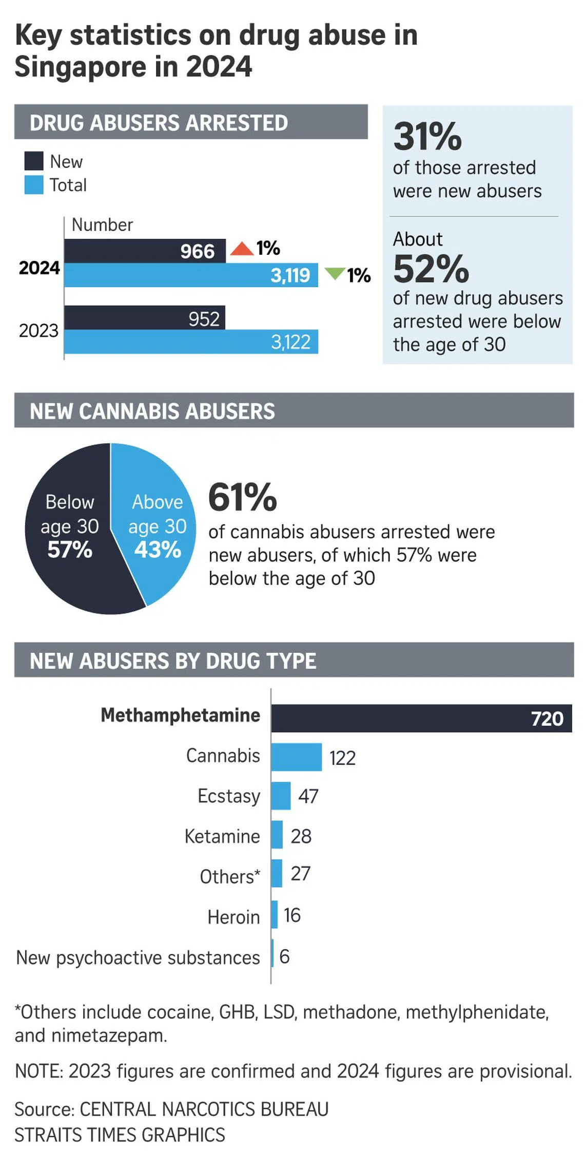 SINGAPORE – There were 126 new drug abusers under the age of 20 arrested in 2024, 30 per cent more than the 97 nabbed in 2023