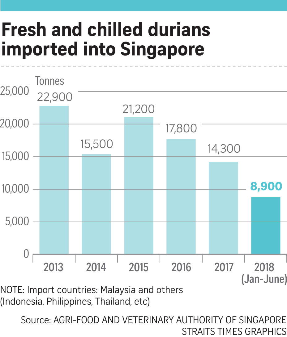 According to the latest figures from the Agri-Food and Veterinary Authority of Singapore (AVA), 8,900 tonnes of fresh and chilled durians were imported into Singapore, more than the amount recorded at the halfway point last year, when 14,300 tonnes were imported for the whole of 2017.