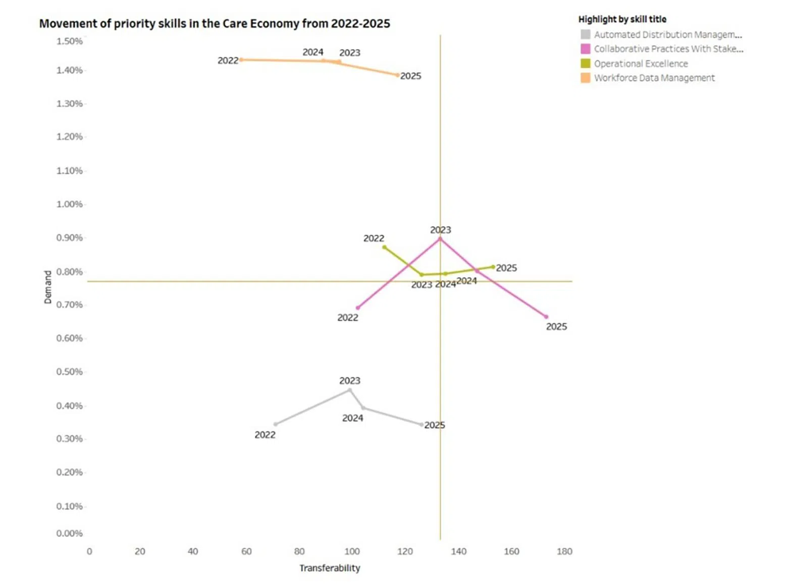 The Priority Skills dashboard, showing the placement of skills on a quadrant according to their demand and transferability.