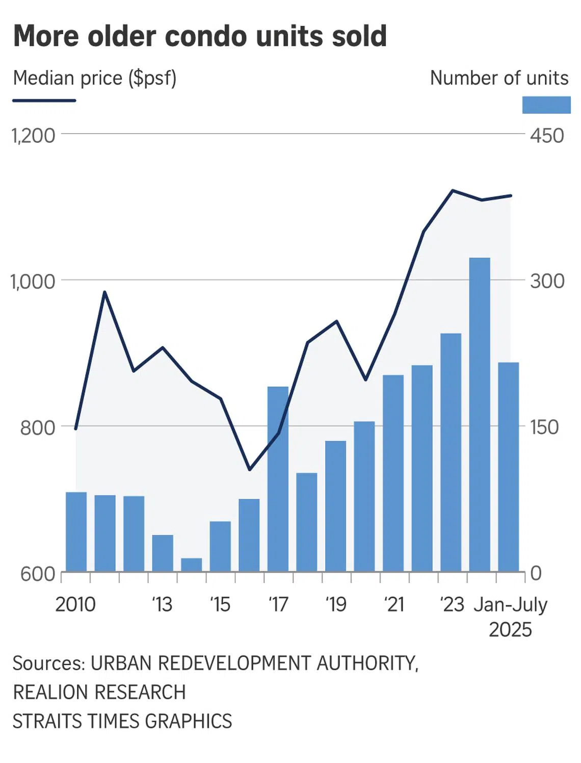 The latest data from URA and Realion Research showed that from January to July 2025, the median price of newer, leasehold condos less than five years old was $2,479 psf, 122.3 per cent higher than the median price of older condos at least 40 years old at $1,115 psf.