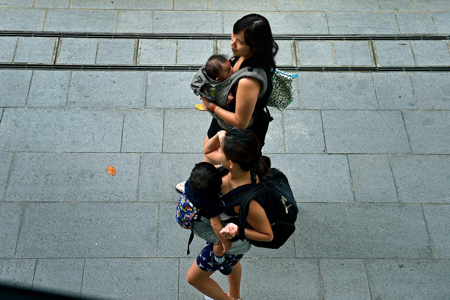 Mothers with babies slung in front of them as they walk along Orchard Road.