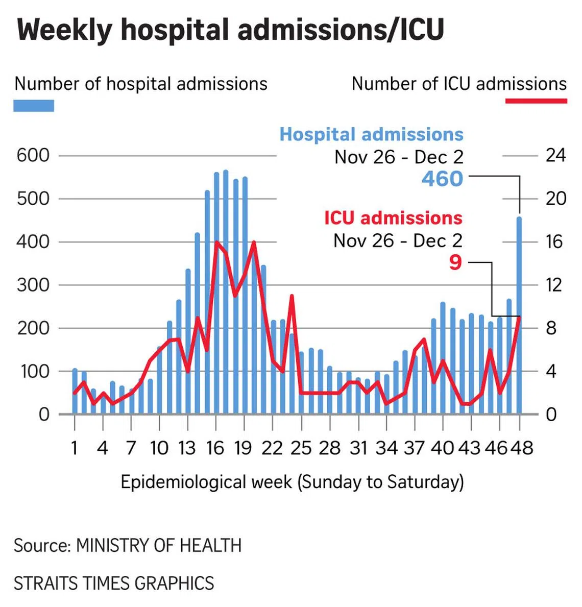 An MOH statement on Dec 8 said the average daily Covid-19 hospitalisations rose to 225 from 136 the week before, and the average daily intensive care unit (ICU) cases increased to four cases compared with one case in the previous week.