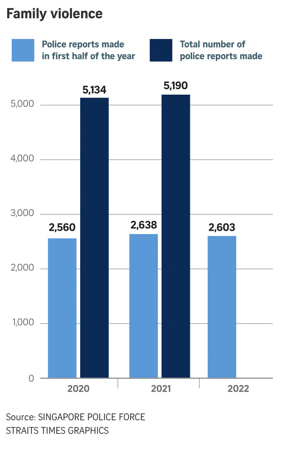 SINGAPORE - More people are making police reports on family violence, with a total of 5,190 reports filed in 2021, up from 5,134 in 2020, said the police on Monday.