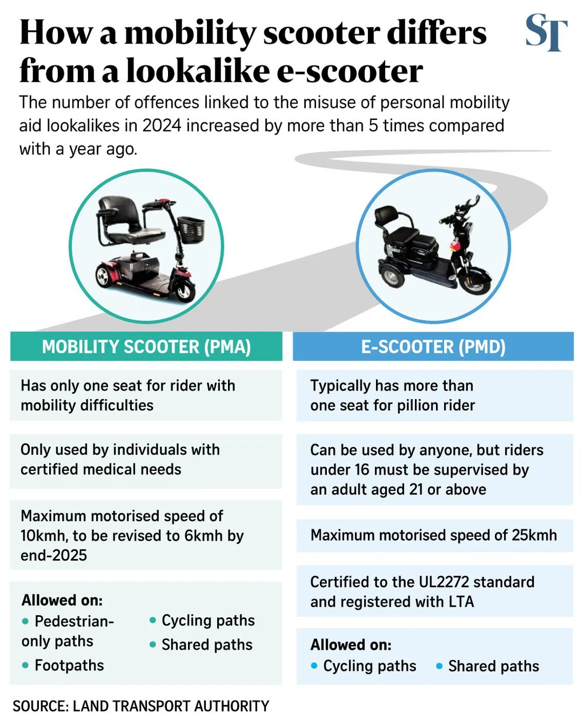 SINGAPORE - The number of offences linked to the misuse of personal mobility aid (PMA) lookalikes in 2024 increased by more than five times compared with a year earlier, said the Land Transport Authority (LTA).
