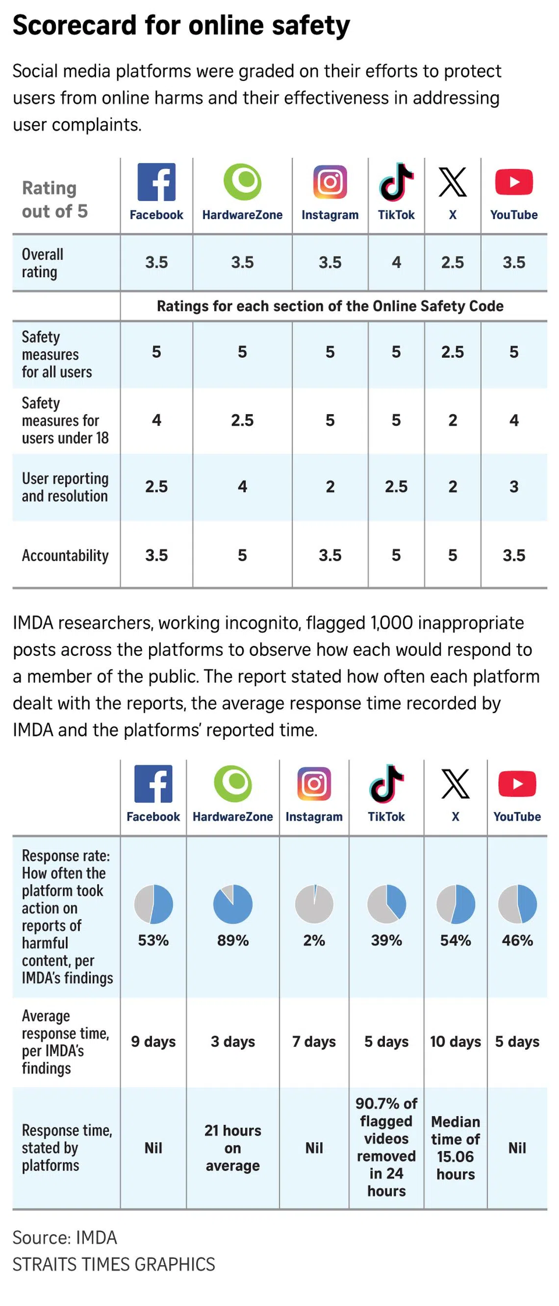 Posing as members of the public between August 2023 and July 2024, IMDA analysts flagged more than 1,000 harmful posts across the six social media platforms and observed their responses.