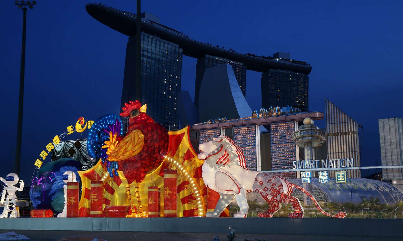 The main lantern set piece at River Hongbao 2017, which features a fiery red rooster, which will help usher in the Year of the Fire Rooster.