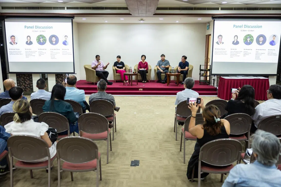 Senior Minister of State for National Development and Foreign Affairs Sim Ann (centre, on stage) in a panel discussion on addressing municipal issues through community-led solutions on Sept 21.