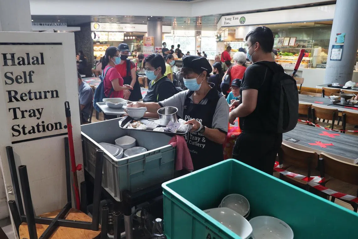 Patrons returning their used crockery at the NTUC Foodfare outlet in AMK Hub in January 2022.