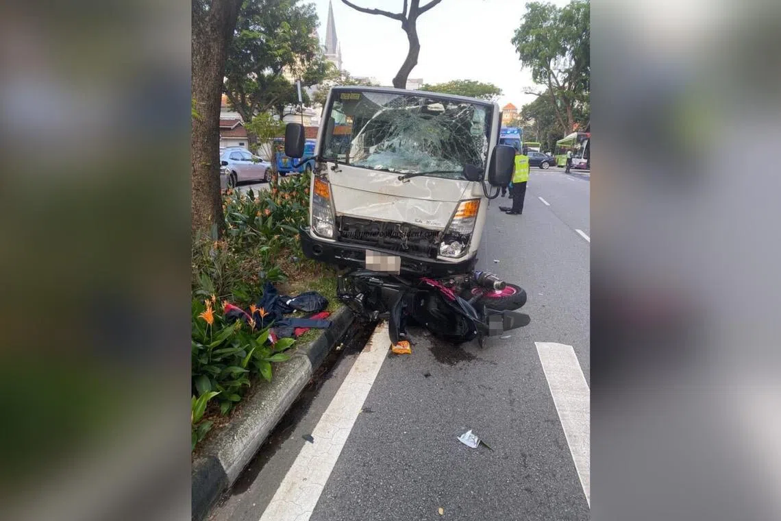 SINGAPORE – A motorcyclist was killed after a collision between his motorbike, a lorry and a bus near Chijmes on Thursday morning.