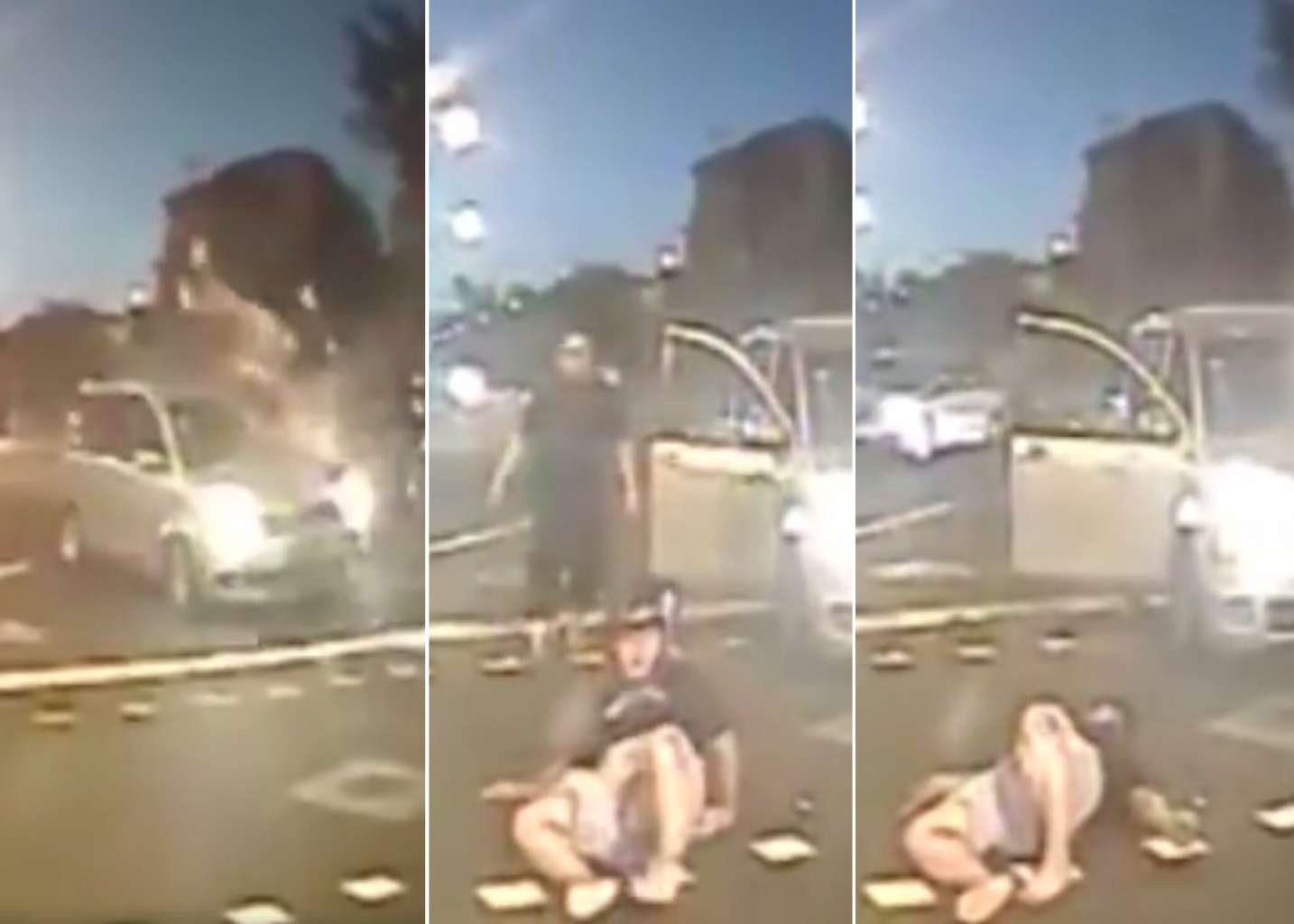 The impact flung the motorcyclist up into the air and over the car.