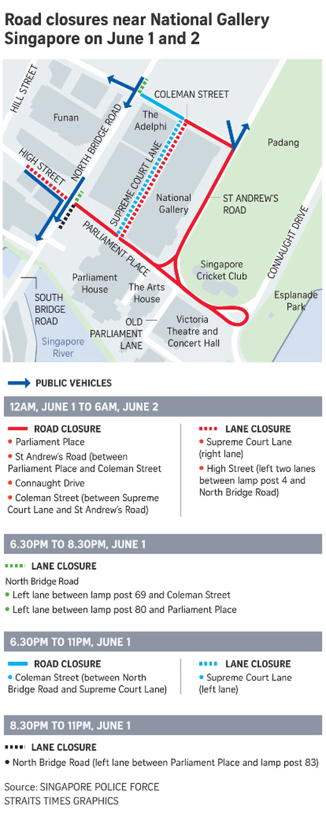 Parking will not be allowed at the National Gallery from 12am on June 1 until 12am on June 2. Vehicles that are parked illegally or cause obstruction will be towed away, police said.