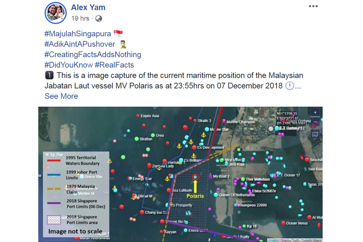 And the image Mr Yam, who is executive director of the People's Action Party (PAP) headquarters, posted showed Malaysian Marine Department vessel MV Polaris squarely within Singapore territorial waters as at 11.55pm on Friday.