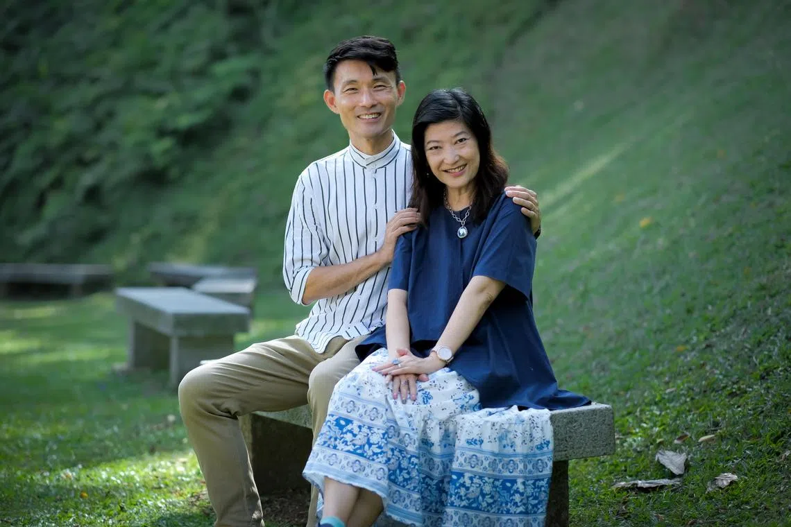 Ms Lim Hai Yen and her husband, Mr Baey Yam Keng, at Fort Canning Park in May 2023. This was where he proposed to her in 1996.