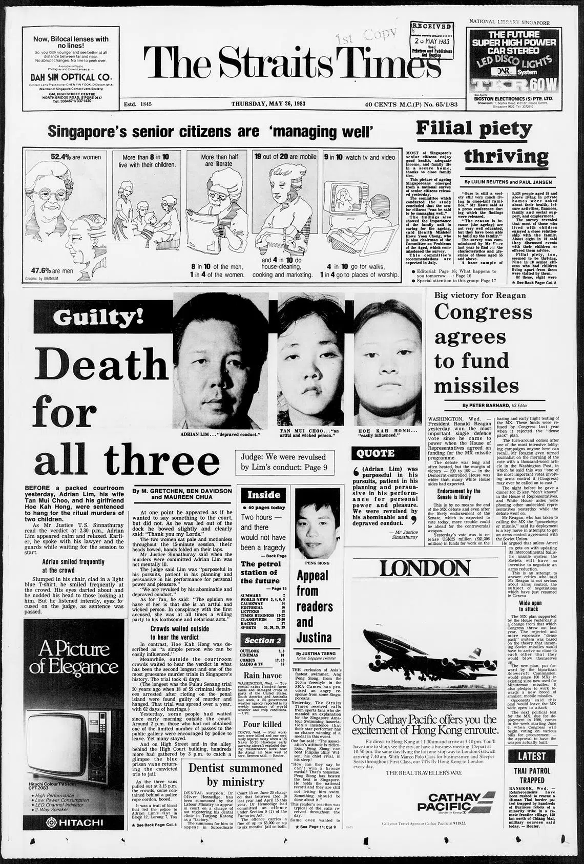 Self-proclaimed spirit medium Adrian Lim, his wife Catherine Tan Mui Choo and mistress Hoe Kah Hong were on May 25, 1983, sentenced to hang for the ritual murders of two children. The sentence was reported on Page 1 the next day.