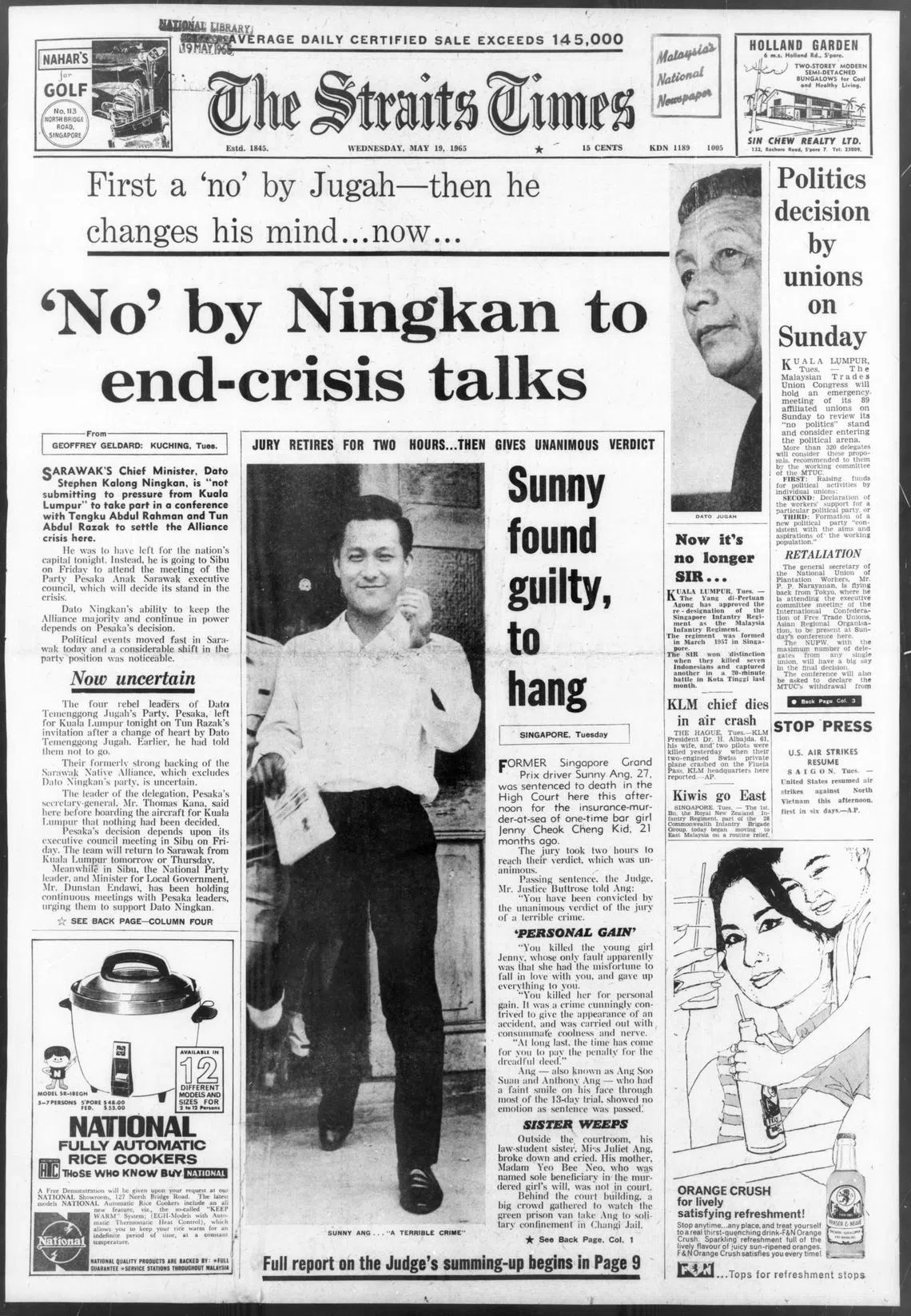 An article on May 19, 1965, about Sunny Ang Soo Suan being convicted of murdering Ms Jenny Cheok Cheng Kid and sentenced to hang. The conviction was based entirely on circumstantial evidence as the body was never found.