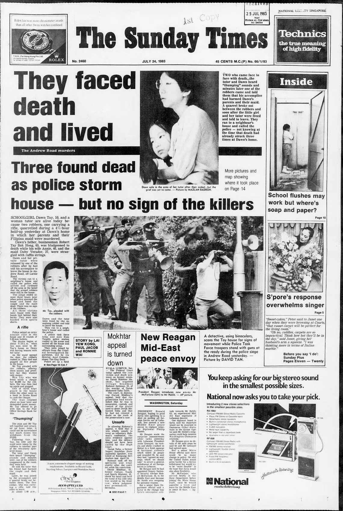 Dubbed the Andrew Road murders, the story written by Lai Yew Kong, Paul Jacob and Ronnie Wai was the lead story in The Sunday Times on July 24, 1983.