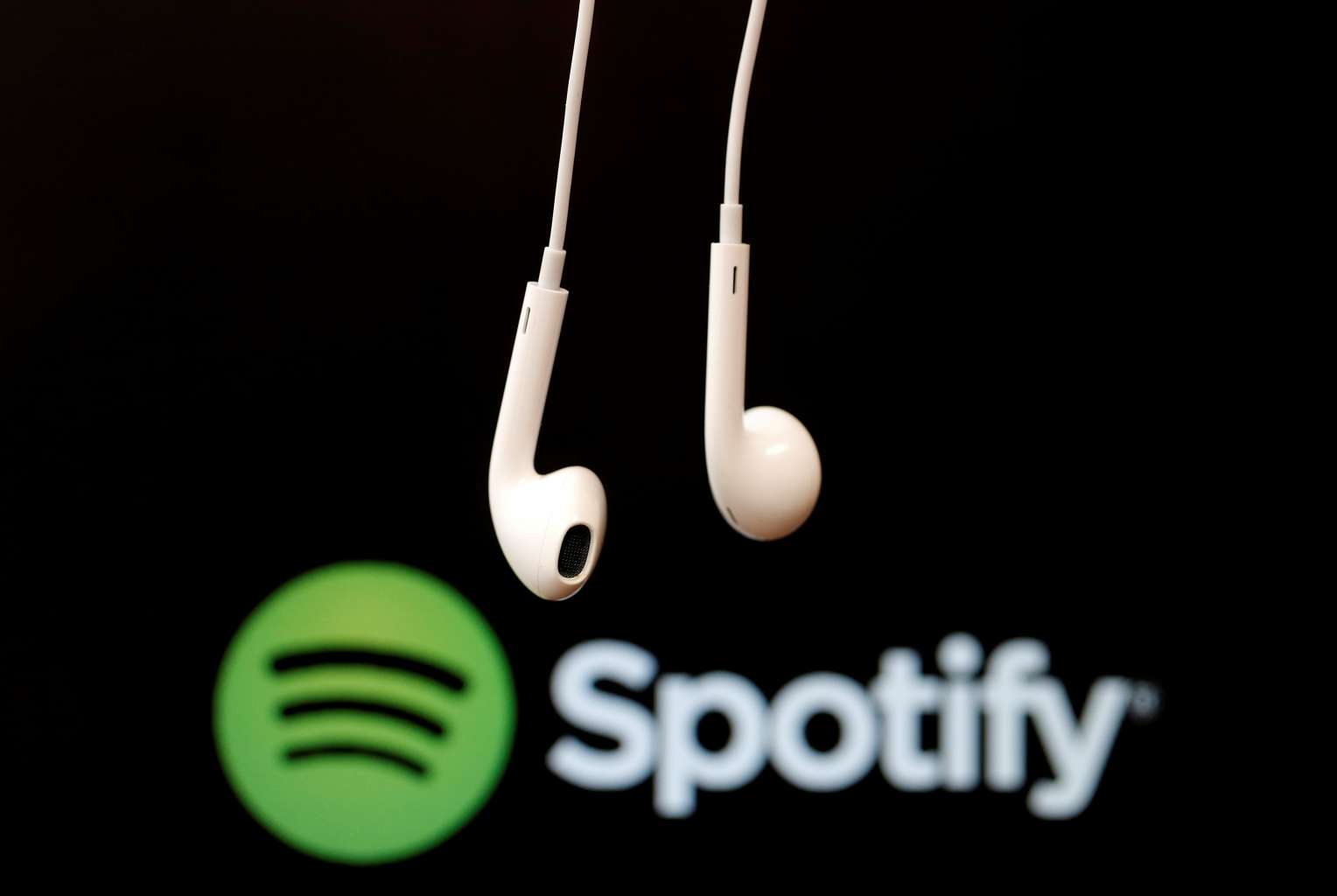Headphones are seen in front of a logo of online music streaming service Spotify.