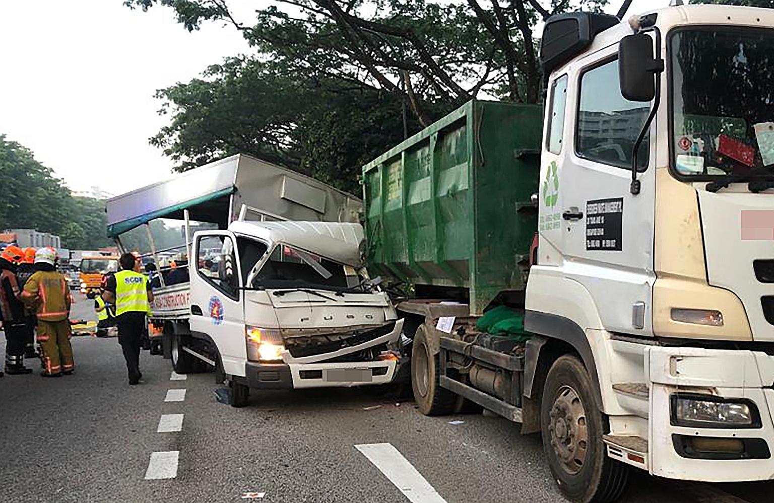 A 33-year-old Bangladeshi man, who was one of 17 migrant workers travelling in the back of a lorry, died after the vehicle collided with a stationary tipper truck (above) on the Pan-Island Expressway early yesterday morning. A 36-year-old male lorry driver was arrested for careless driving causing death.