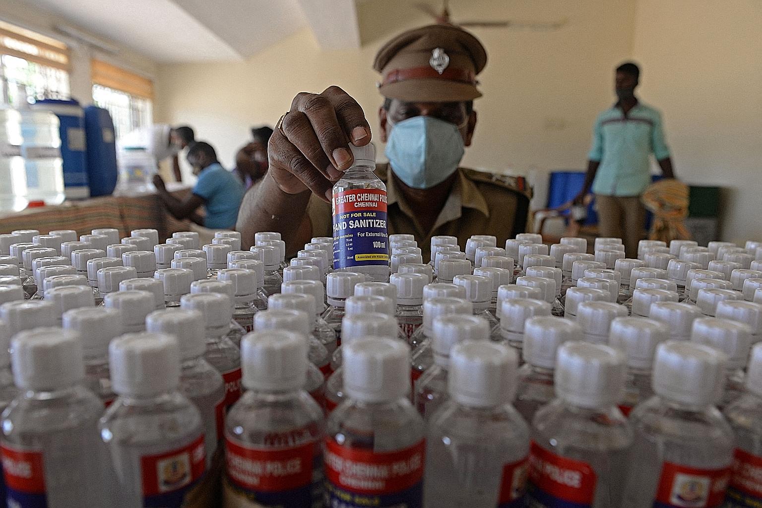 Hand sanitiser being prepared for distribution in Chennai yesterday.