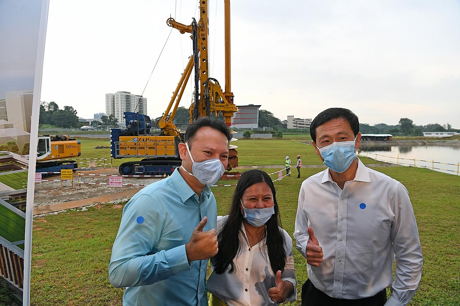 (From left) Senior Minister of State for Defence and Manpower Zaqy Mohamad, MP for Sembawang GRC Mariam Jaafar and Transport Minister Ong Ye Kung at the parcel of land that will be the site of the Woodlands North RTS station.