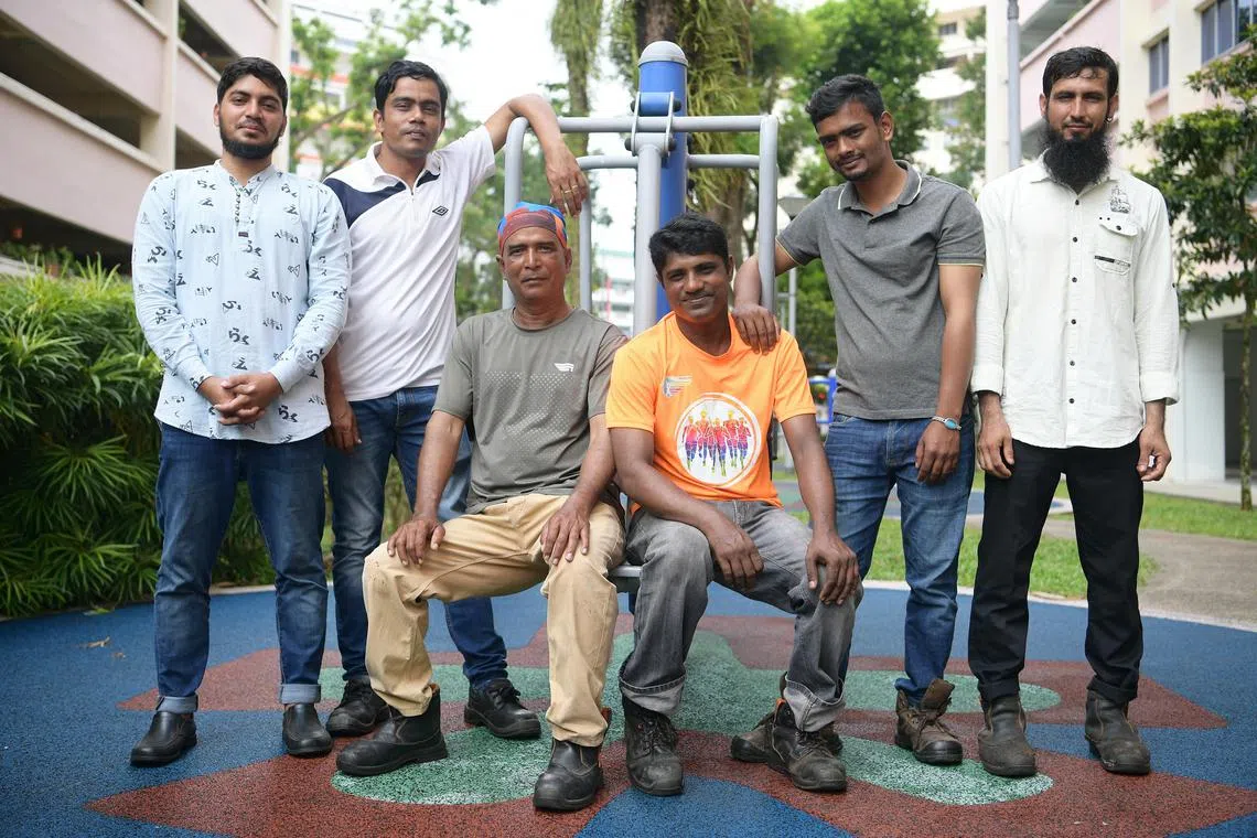 Workers (from left) Md Abuhaiat Nurnobi, Belal Md Shababuddin, Miah Eadhu, Alam Jahangir, Molla Mohammad Sayem and Khobir helped lift the car to free Ms Lim Xiaoli’s daughter Kaelyn.