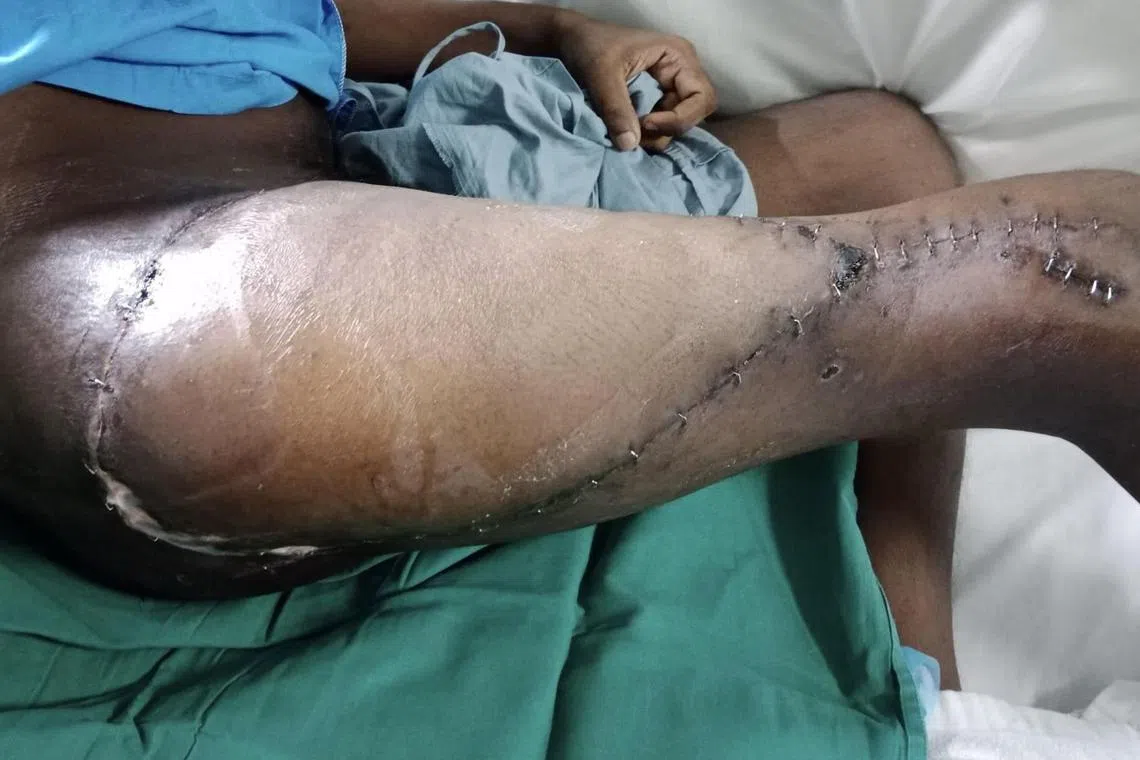 An industrial fan sliced through Mr Muthupandi's right thigh bone and almost severed his leg. He had to undergo three major surgeries after the accident.