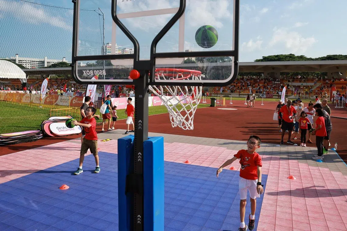 Participants trying out basketball at the GetActive! Singapore Heartland Festival in Bedok.