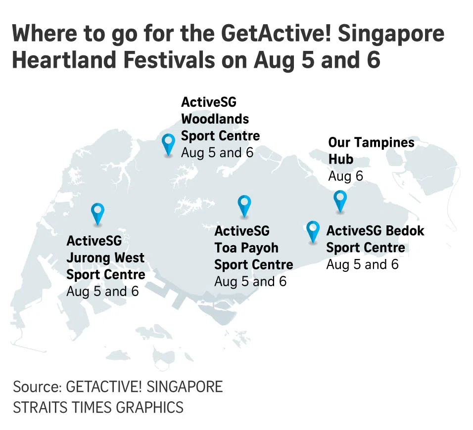 Organised by Sport Singapore and the National Day Parade 2023 Heartland Celebrations Committee, the festivals – which will continue on Sunday – were held at Bedok, Jurong West, Toa Payoh and Woodlands stadiums. The festival at Our Tampines Hub will take place only on Sunday.