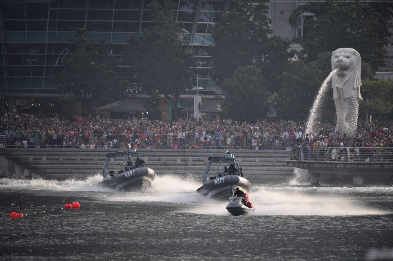 The Republic of Singapore Airforce's show of military might was closely followed by similarly spectacular displays by the navy and army, including a helocast joint display involving naval divers jumping into the waters surrounding the bay from a helicopter.