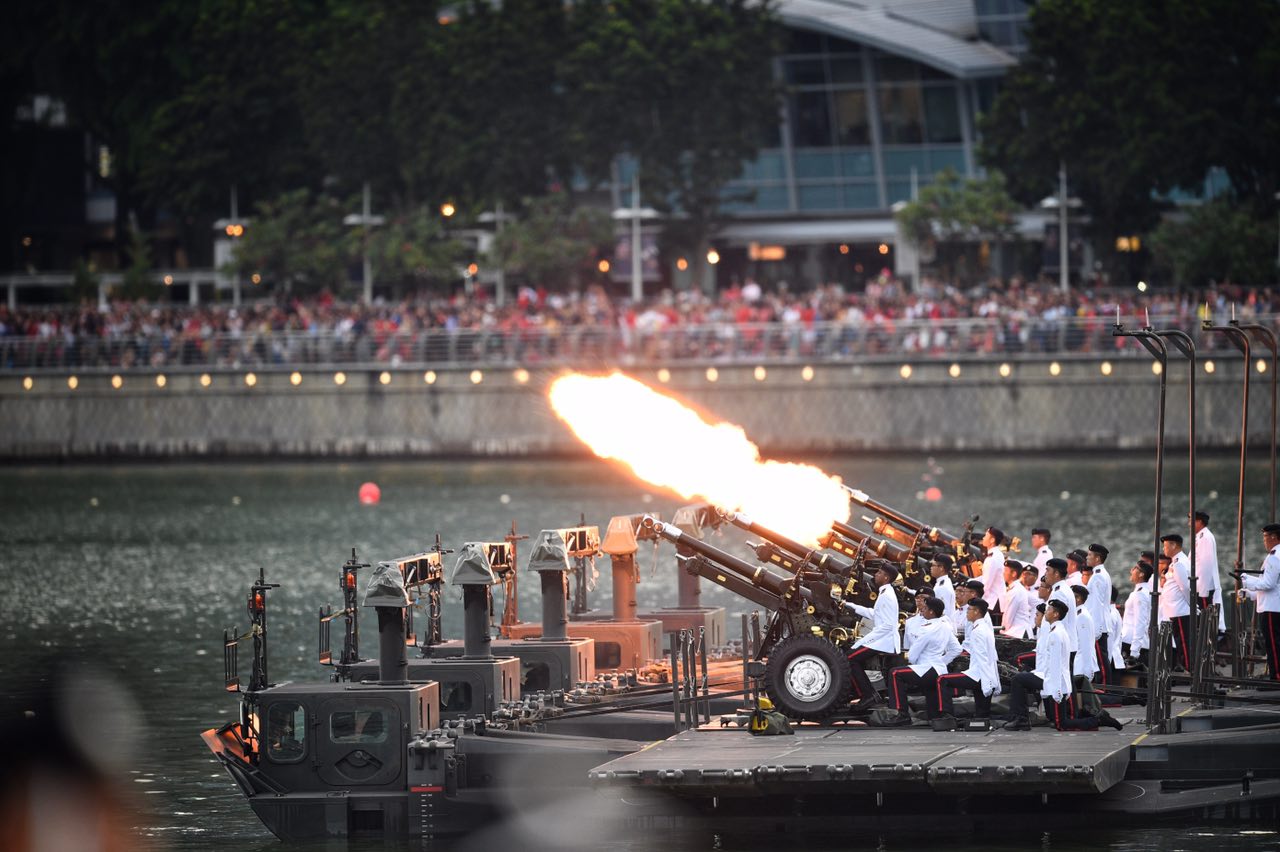 To mark NS50, which is the 50th-year milestone of national service in Singapore, the first round from each of the four guns on board the M3G raft will be fired by operationally ready national servicemen. The rest of the shots were fired by full-time national servicemen.