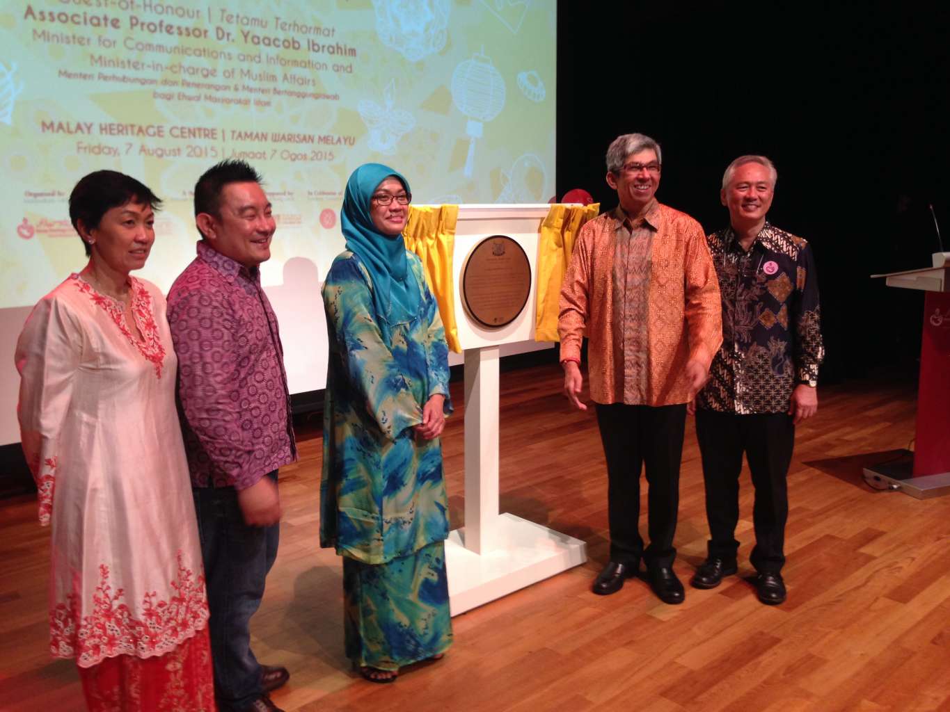 Dr Yaacob Ibrahim (in orange batik), Minister for Communications and Information and Minister-in-charge of Muslim Affairs, unveiling the national monument plaque at the Istana Kampong Gelam on Friday, Aug 7, 2015.
