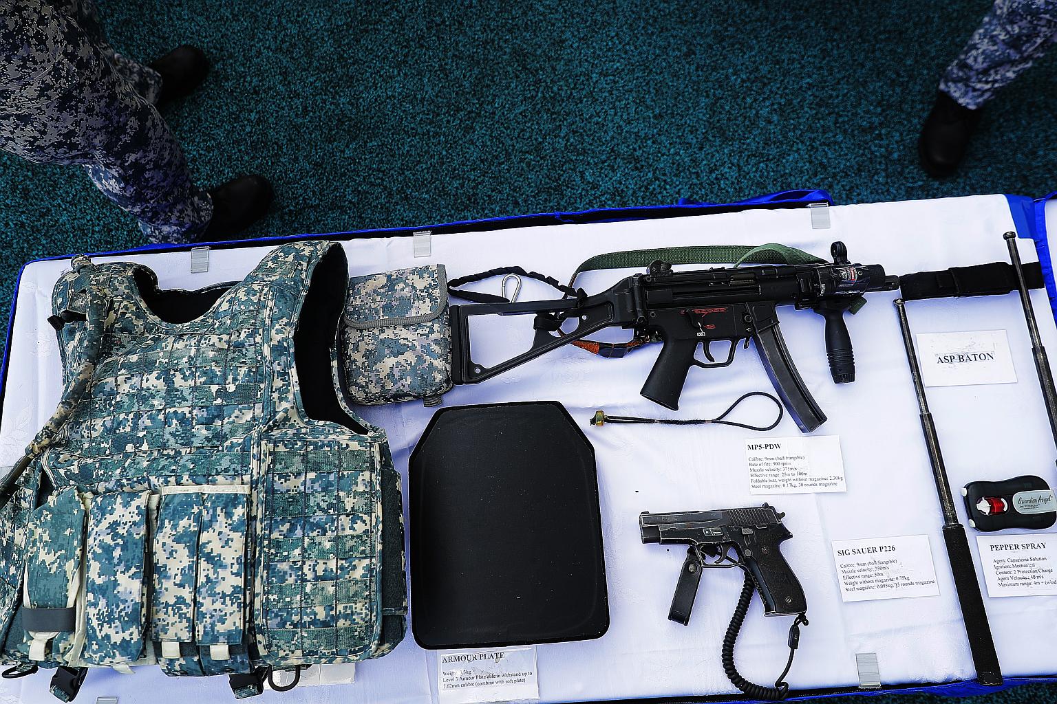 In their full gear, the sea marshals of the Navy's 180 Squadron are "armed to the teeth", said the squadron's commanding officer Lieutenant-Colonel Nick Neo. They carry a semi-automatic weapon, a pistol, a baton and a pepper spray, among other items.