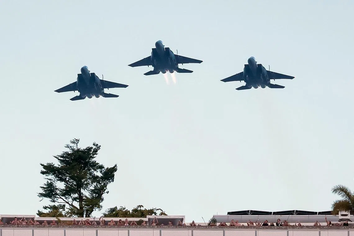 RSAF F-15s flying over Marina Bay Sands during an aerial display at the National Day Parade on Aug 9, 2023.