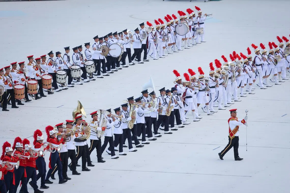 A military tattoo comprising bands from the SAF, SPF, Bowen Secondary School and Yuhua Secondary School kick-starting the parade.
