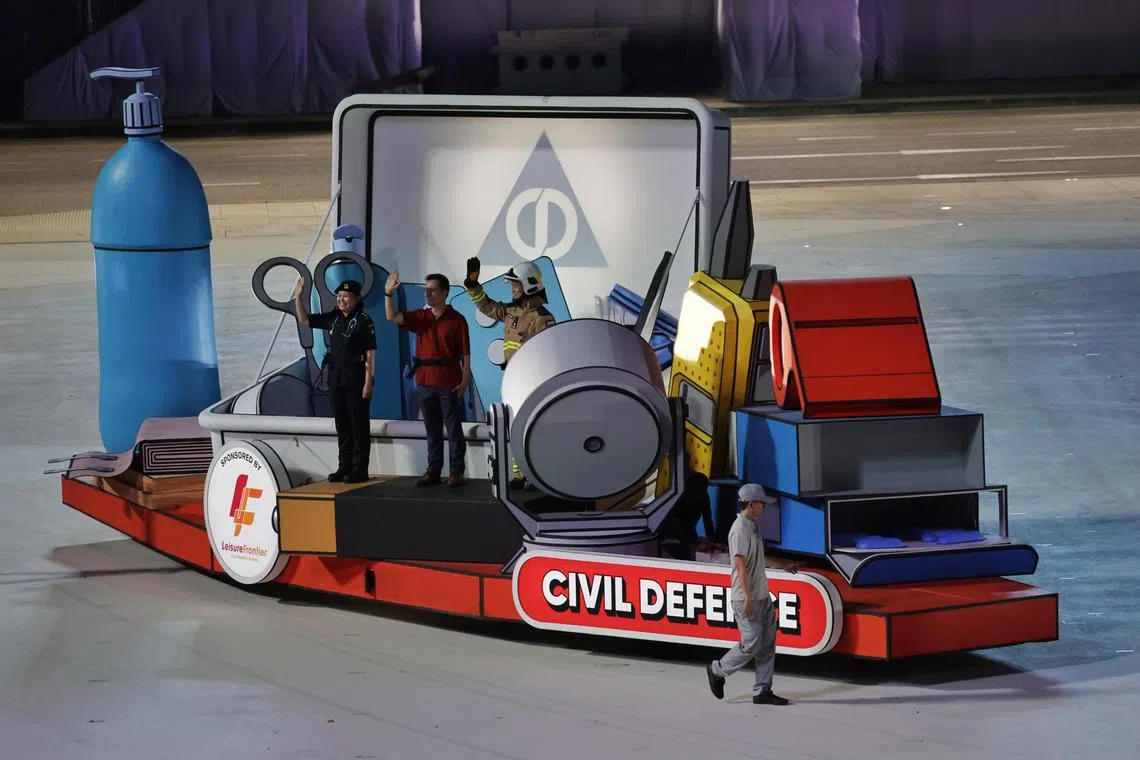 A float representing Civil Defence at the National Day Parade on Aug 9, 2023.