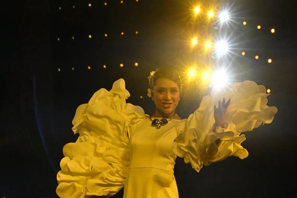 Featuring 588 students – some dressed like kueh lapis – from Nanyang Junior College, Bendemeer Secondary School, CHIJ Katong Convent and Jurong West Secondary School among them, the performers broke out into song as larger-than-life dishes of thosai, nasi lemak and fishball noodles circled the stage.