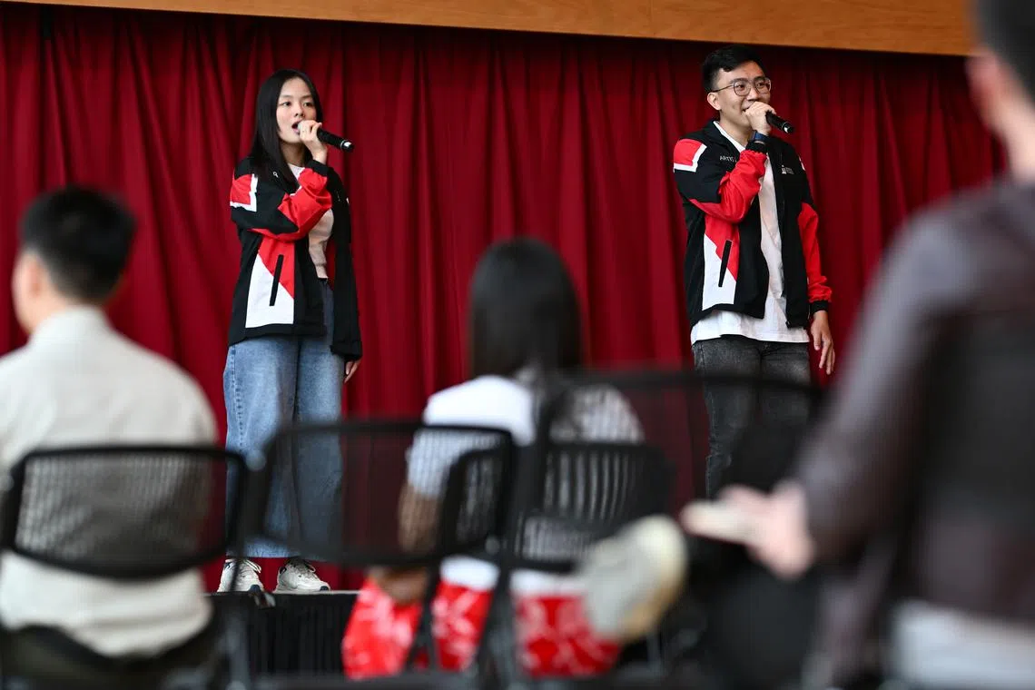 Undergraduates from SIT Vocalist Insight Lucas Lian (right), together with Soo Yi Wei, during the NDP 2025 Media Event 5 on June 30.