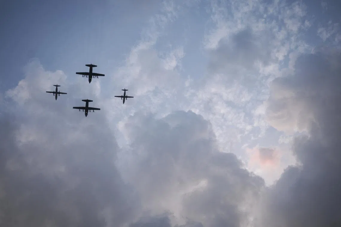 Two C-130- Hercules aircraft and two Fokker-50 transport aircraft during the Transport Formation fly-past on Aug 9.