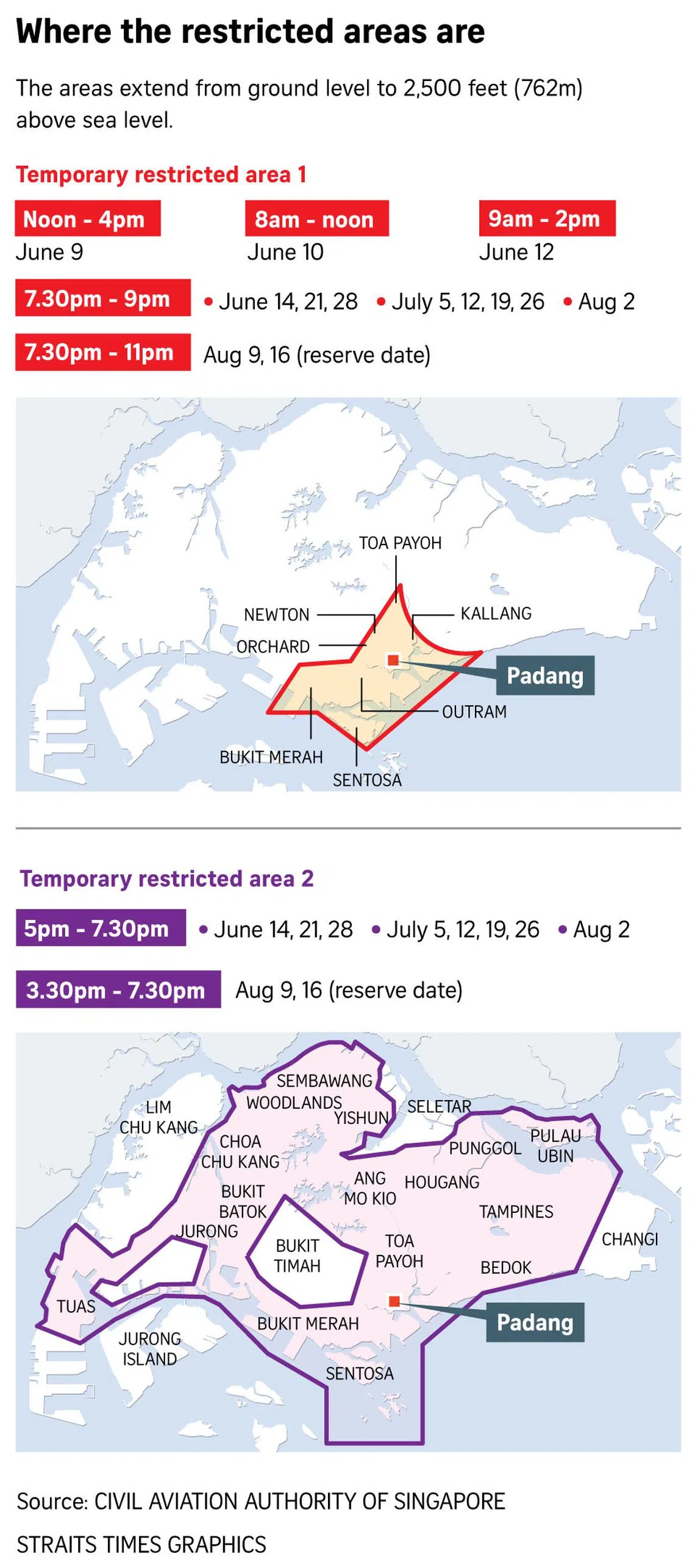 The temporary restricted areas, which include heartland locations, such as Bedok and Jurong West, will extend from ground level to 2,500ft (762m) above mean sea level.