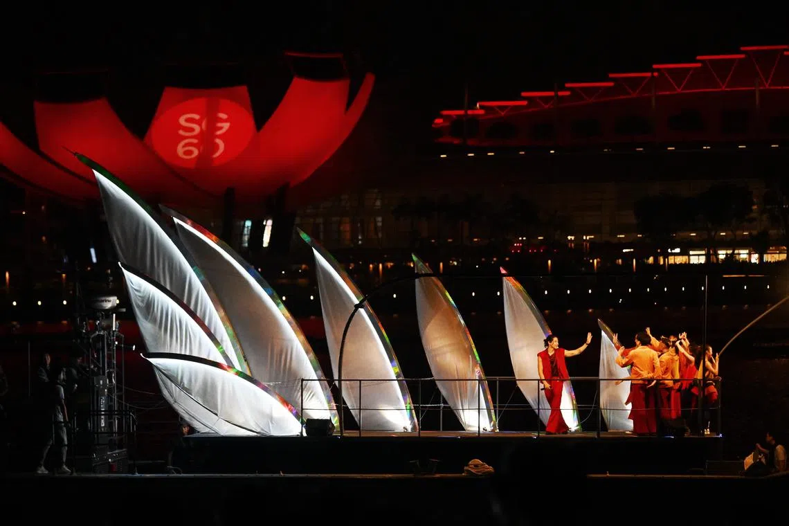 As the clock approached 8pm, singer Benjamin Kheng serenaded the audience with the NDP 2024 theme song Not Alone from a mobile floating stage on the bay, performing it as a duet with singer Rahimah Rahim at the Padang.