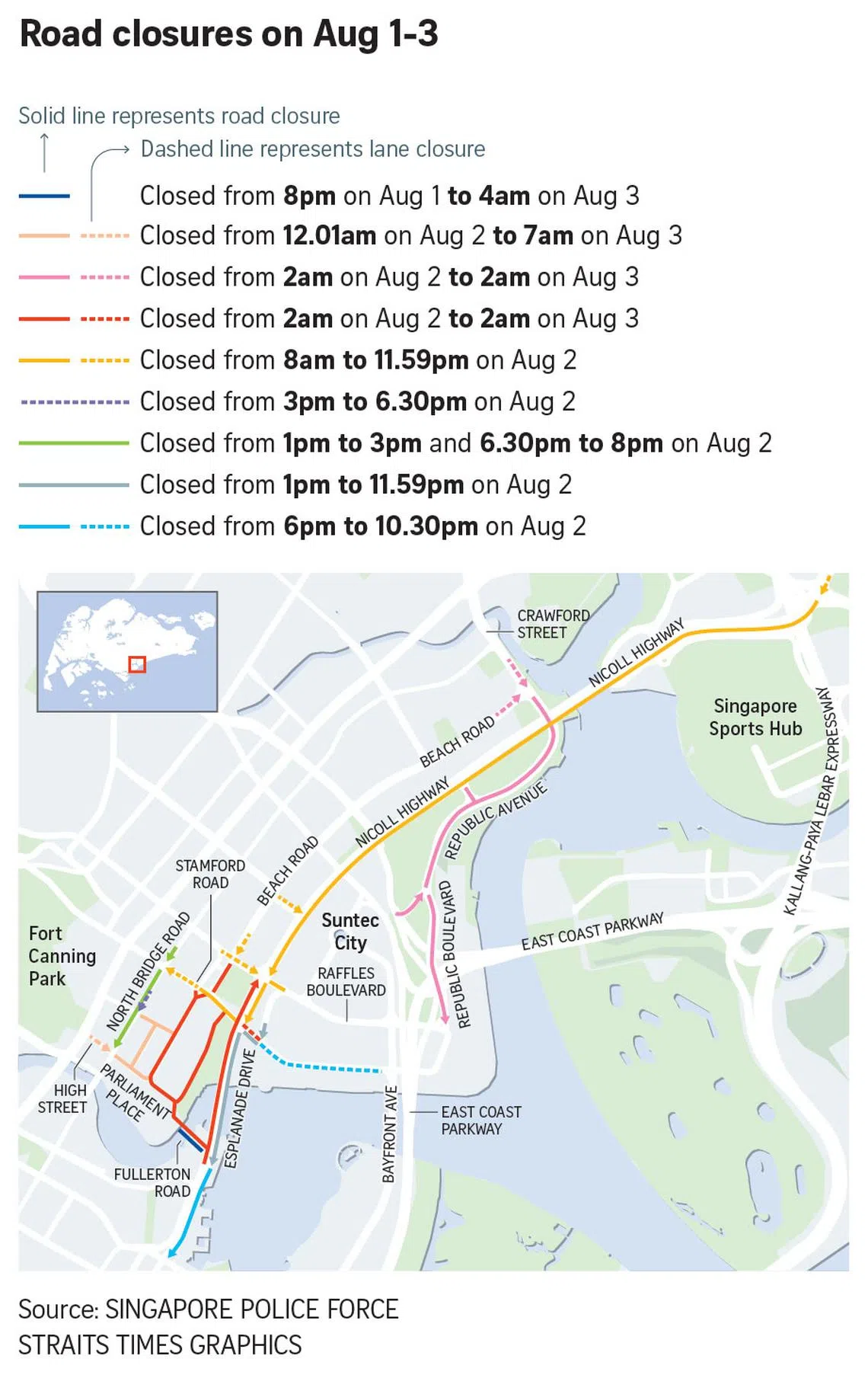 Selected roads and lanes in the Marina Bay area will be closed on Aug 2, such as parts of Bras Basah Road and Raffles Boulevard. Only the likes of police and emergency vehicles will be given access during the closure.
