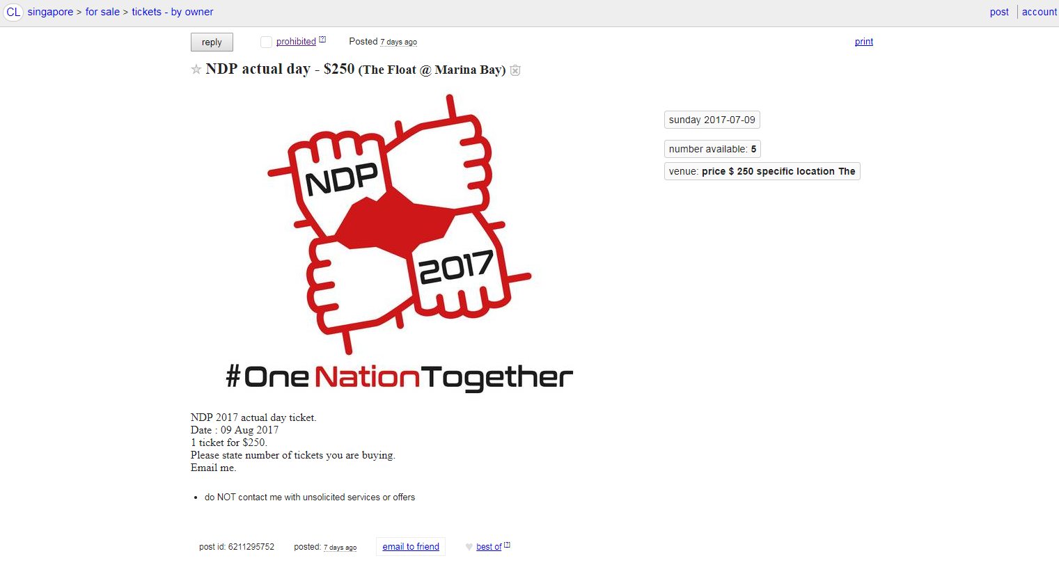 An advertisement on Craigslist on July 9, listing five National Day Parade tickets for sale.