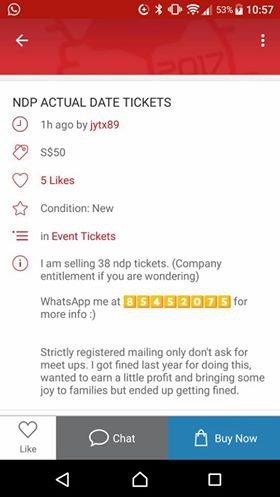 SINGAPORE - National Day Parade (NDP) tickets are being touted on online marketplaces such as Carousell, eBay and Craigslist for the hefty price tag of up to $400 each.