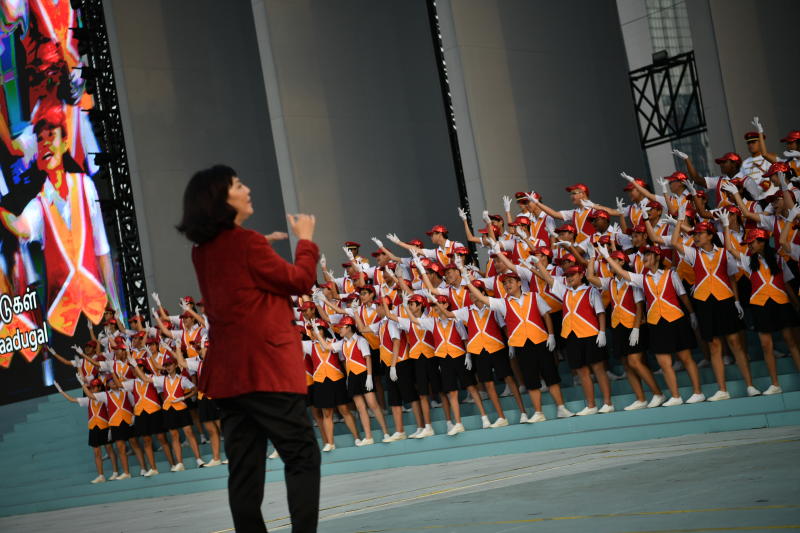Conducting this year's combined school choir is Ms Lim Jiuan, 59, who teaches at Nan Hua High School.