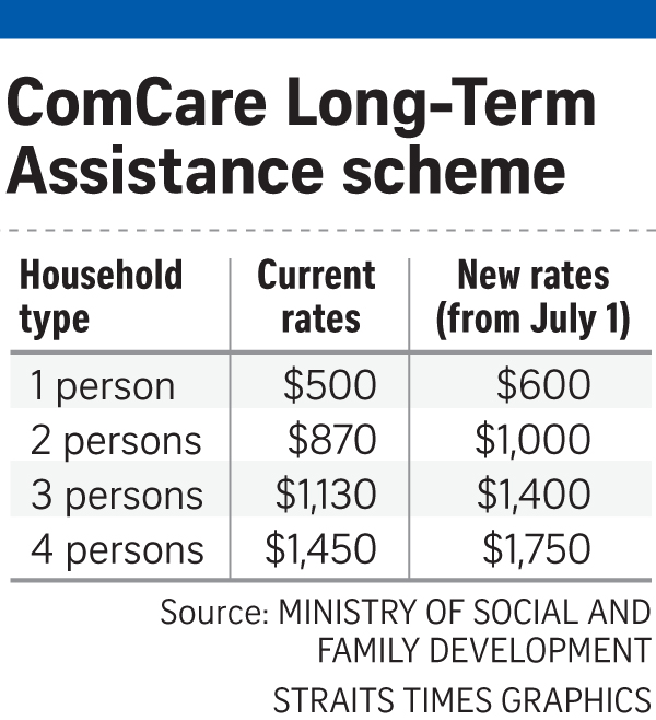 From July 1, a single person on the ComCare Long-Term Assistance scheme will get $600 a month, up from $500. Two-person households will get $1,000 a month, up from $870 now.
