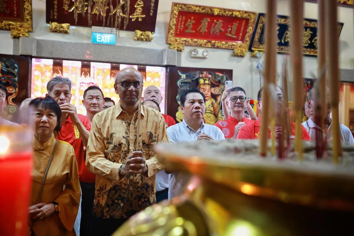 Mr Tharman Shanmugaratnam greeting devotees at the 5th Singapore Sheng Gong Cultural Festival, at Zhen Ren Gong Temple on July 9, 2023.