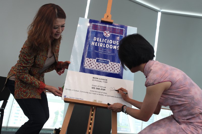 Ms Sim Ann, Senior Minister of State for Communications and Information, and for Culture, Community and Youth, and Ms Ow Kim Kit, author of Delicious Heirlooms, at the launch of the book at the National Library on Feb 16, 2019.