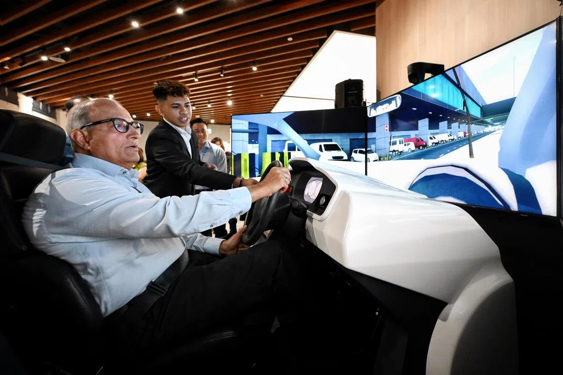 Mr S. Iswaran, Minister for Transport and Minister-in-charge of Trade Relations, trying out the driving simulator at the Airport Operations Simulation Training Centre at ITE College East.