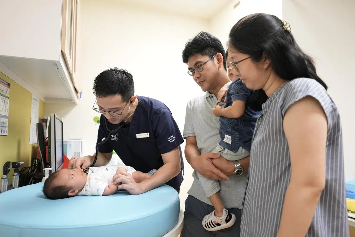 Bukit Panjang resident Gabriel Teo, 34, and his wife with their son at the new children’s specialist clinic at Ng Teng Fong General Hospital with Dr Andrew Sng.